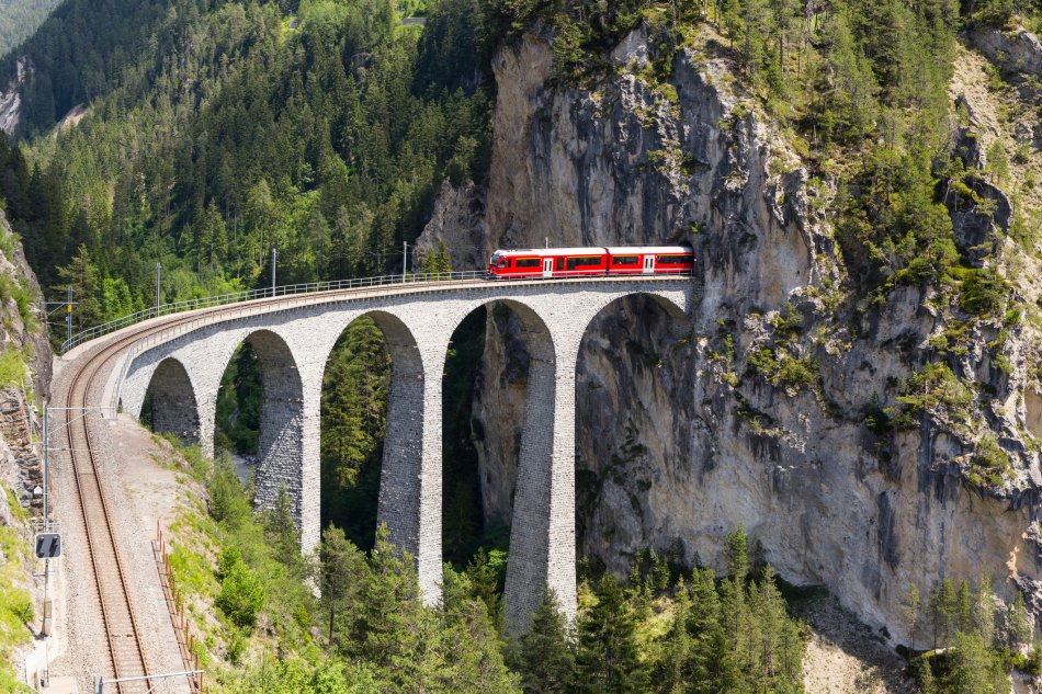 Zwei Bahnstrecken - ein einmaliges Erlebnis. Die Bahnfahrten bieten überwältigende Aussichten auf imposante Berggipfel.